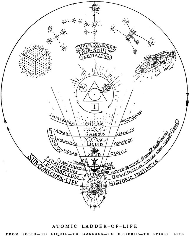 An illustration from The Gate Beautiful by John Ward Stimson (1903). The caption reads: "Atomic Ladder-of-Life: From solid—to liquid—to gaseous—to etheric—to spirit life."