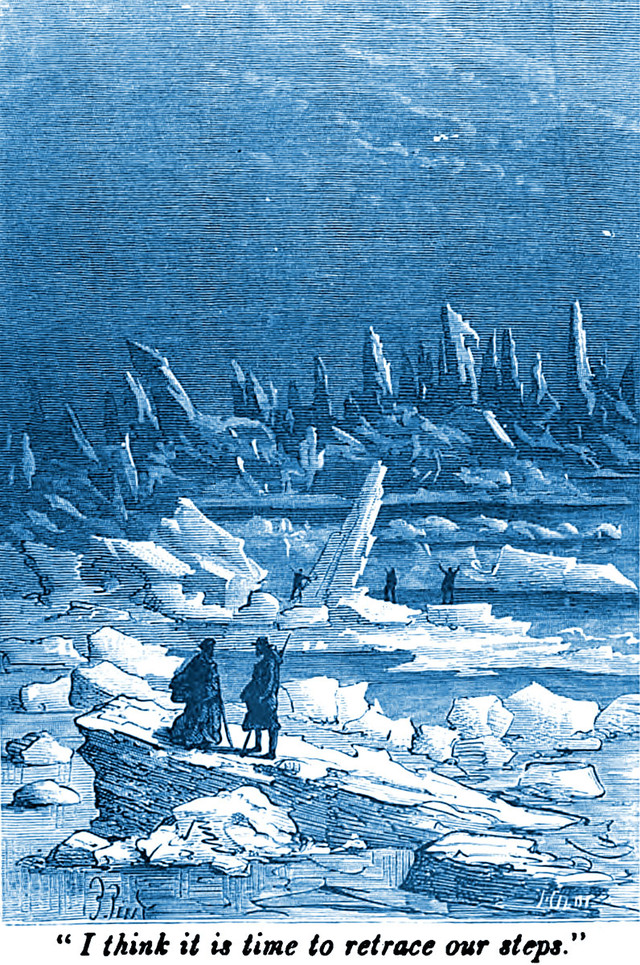 An illustration from The Fur Country by Jules Verne (1874). The caption reads: "I think it is time to retrace our steps."
