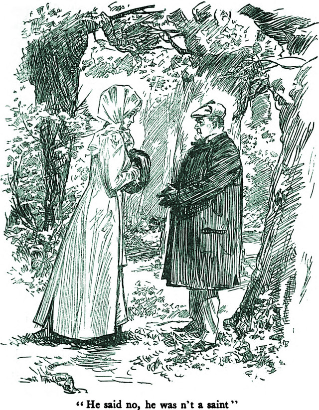 An illustration from Seeing England with Uncle John by Anne Warner (1908). The caption reads: "He said no, he was n't a saint."