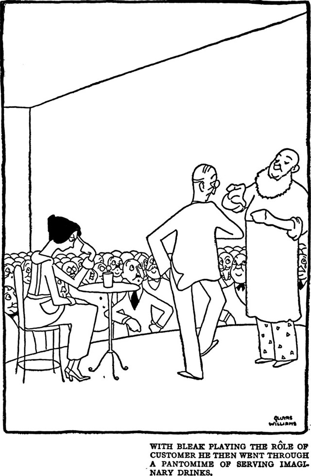 An illustration from In the Sweet and Dry by Christopher Morley and Bart Haley (1919), illustrated by Gluyas Williams. The caption reads: "With bleak playing the rôle of customer he then went through a pantomime of serving imaginary drinks."