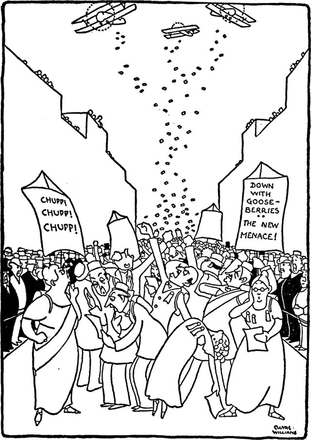 An illustration from In the Sweet and Dry by Christopher Morley and Bart Haley (1919), illustrated by Gluyas Williams. The caption reads: "Down with goose-berries: the New Menace!"