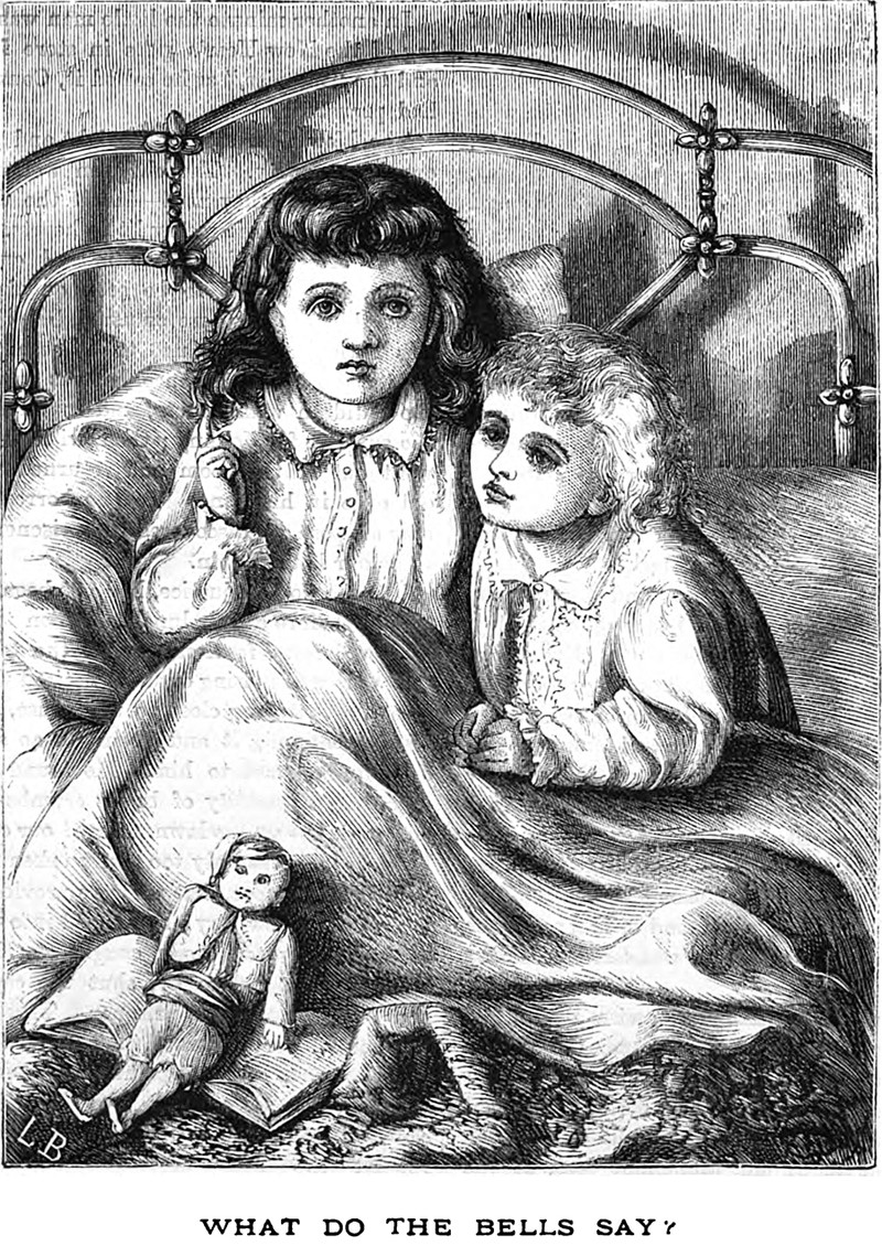 "What do the bells say?" Is the older sibling teaching the younger to count by listening to a distant clock tower, or are the parents conducting a seance in the parlor, the spirit bells shooing away the sandman? (Guess which one we think it is!) From Little Wide Awake: An Illustrated Magazine for Good Children, 1881.