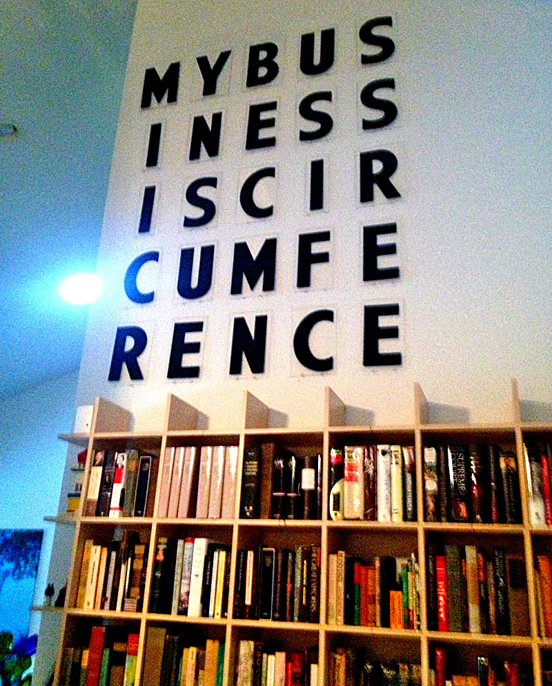 Today's puzzle grid, an Emily Dickinson quotation, appears over a dear reader's bookcase.