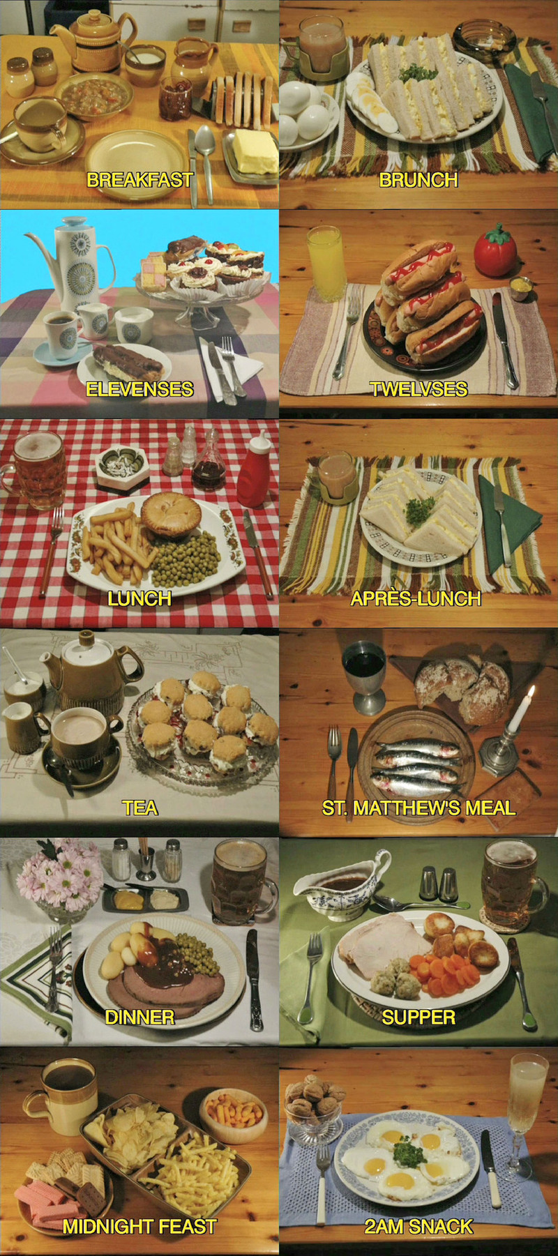 Here's a precursor to the twelve British meals as depicted in the hilarious series Look Around You (2002). Below are the twelve meals, followed by an account from Frank Sullivan's In One Ear (1933), including the succession of "bites" called tiffin, miffin, hiffin, and giffin.