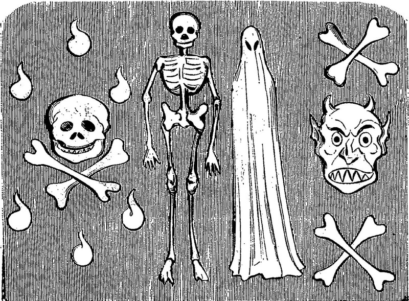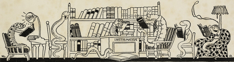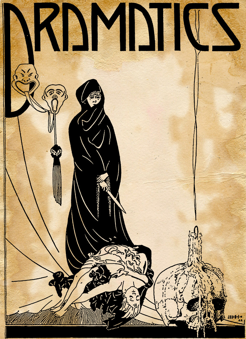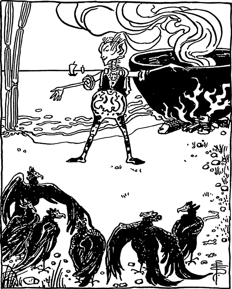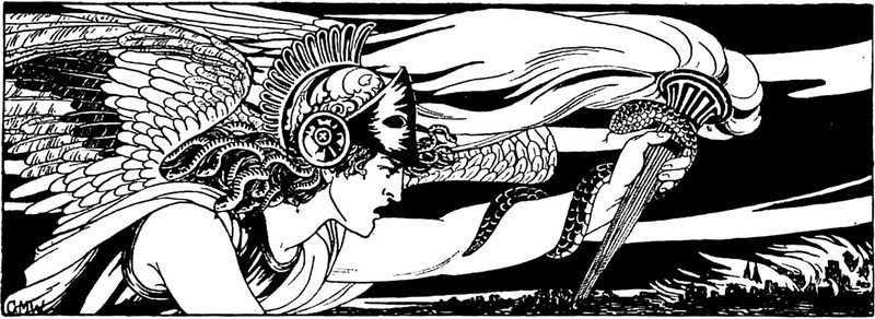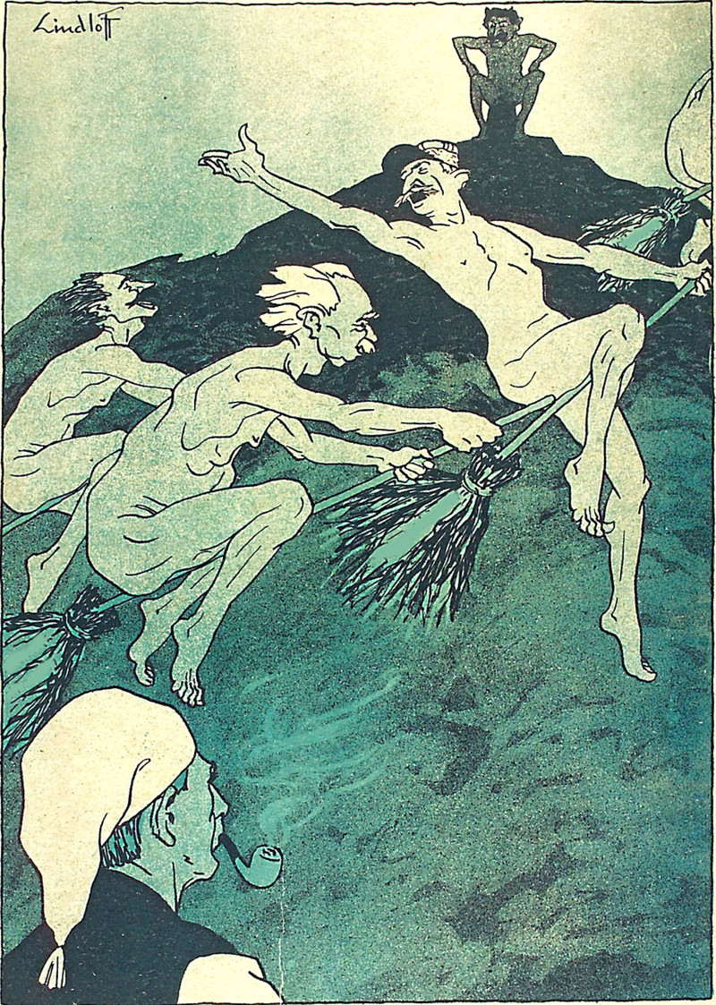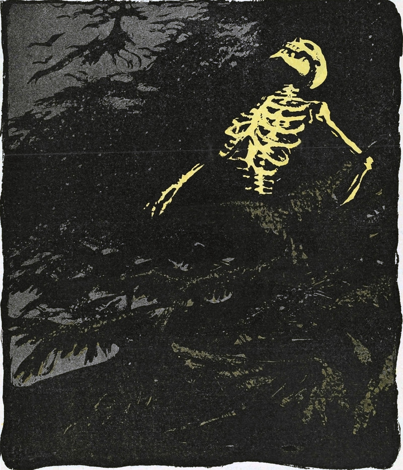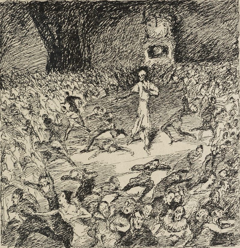 "So many ghosts, and forms of fright, / Have started from their graves tonight. / They have driven sleep from mine eyes away; / I will go down to the chapel and pray" (Henry Wadsworth Longfellow, The Golden Legend). From Satirikon, 1909.
