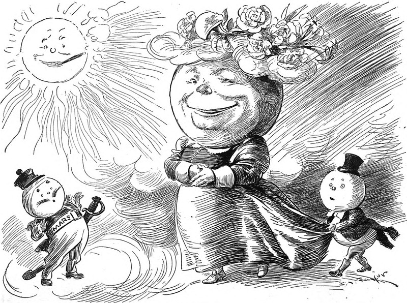 Old Man Winter and the spirits of Cold, Ice, Hail, and Wind are in a face-off with Spring. From Le Courrier Français, 1907.