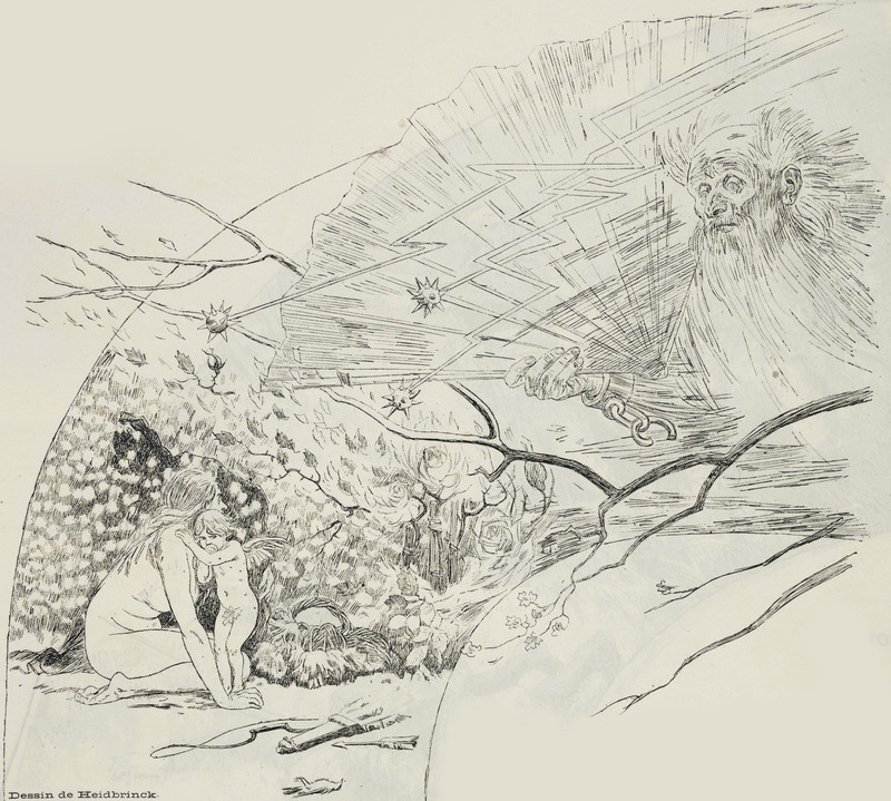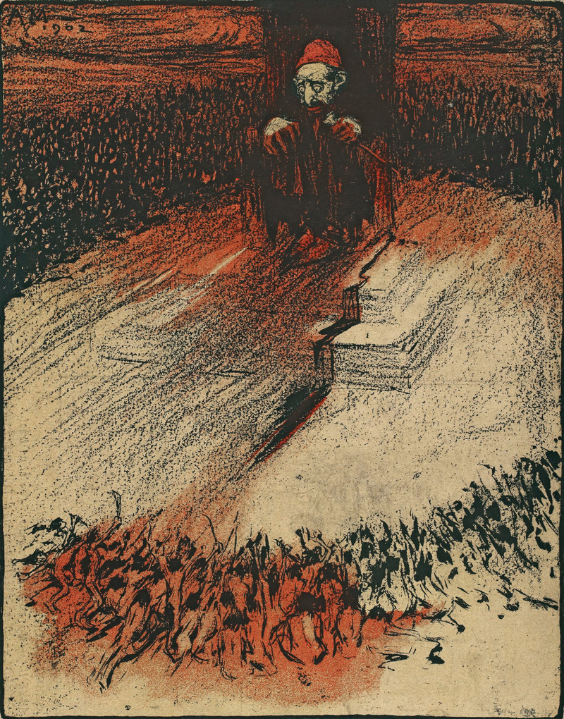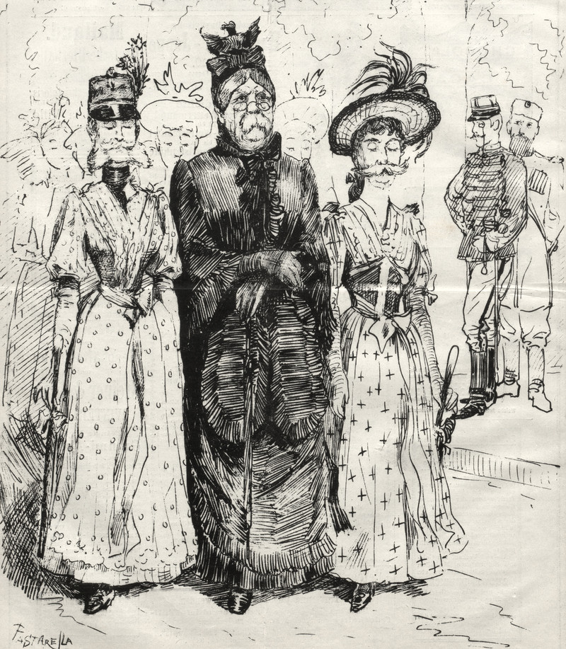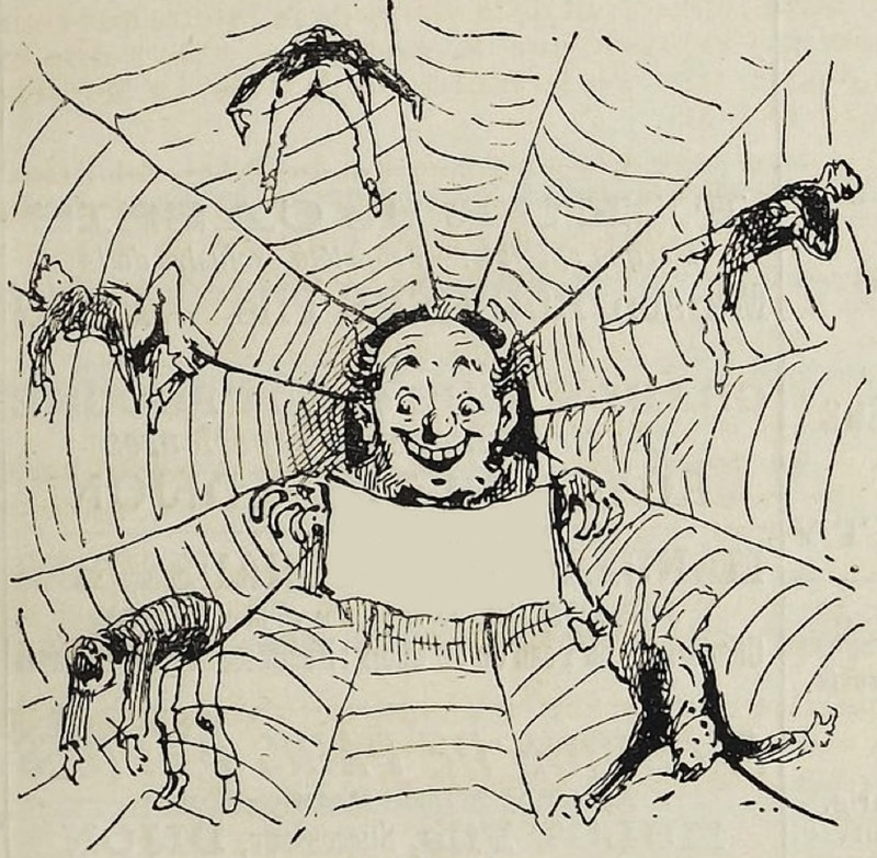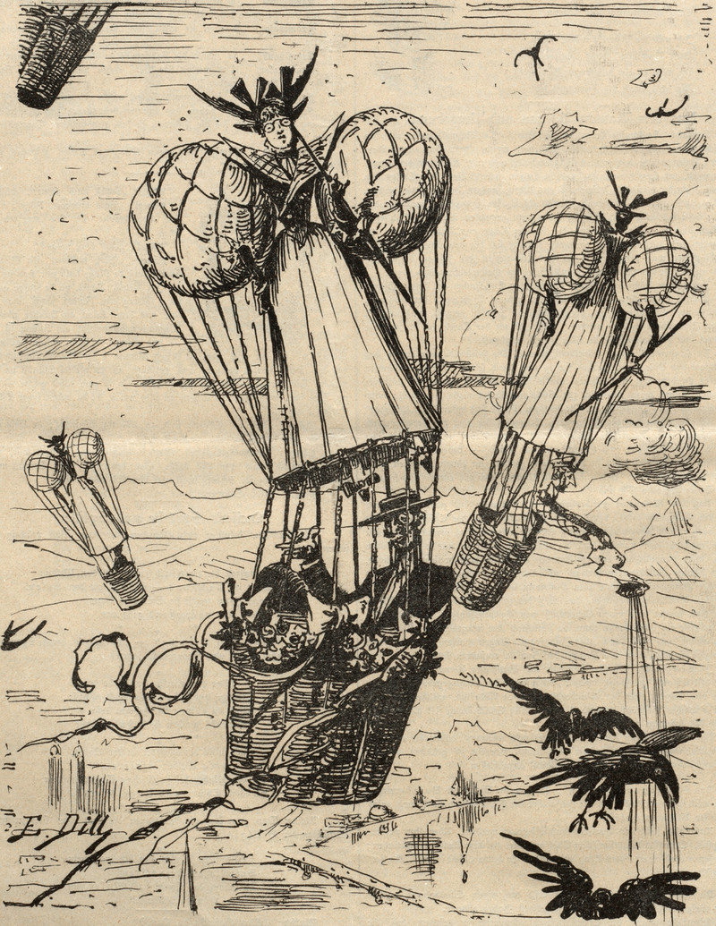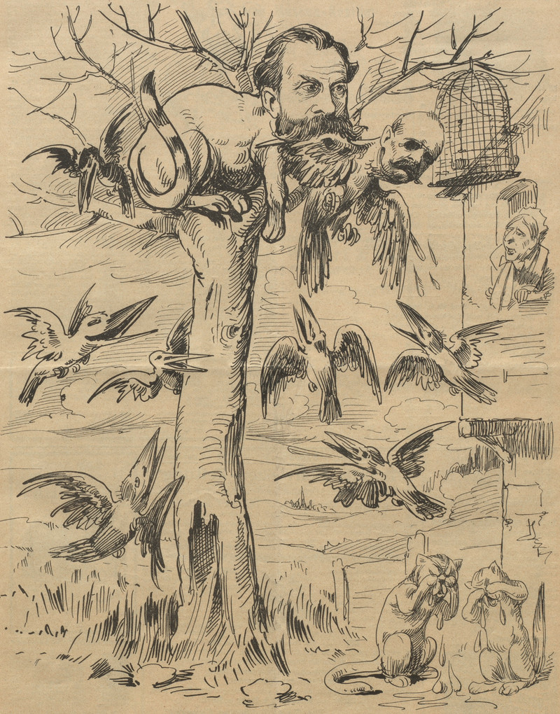 Birds with human heads, arms and hands. From Nebelspalter, 1893.