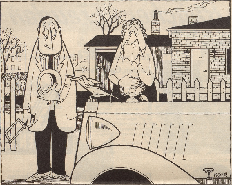 Reblog if there should be more humane ways of dispatching hood ornaments. From Nebelspalter, 1958.