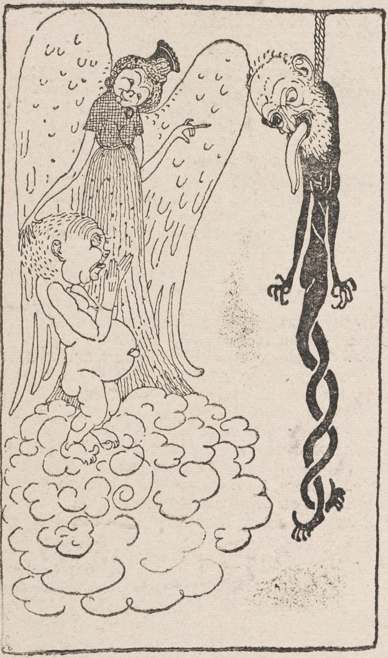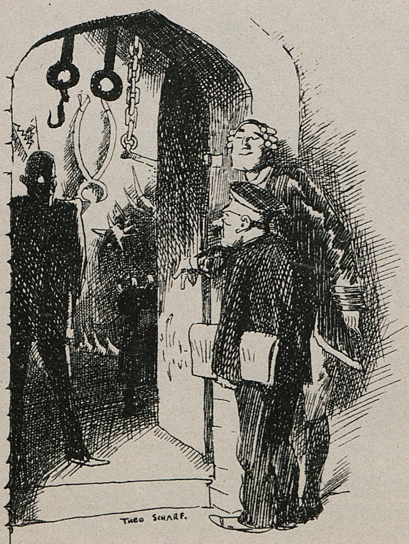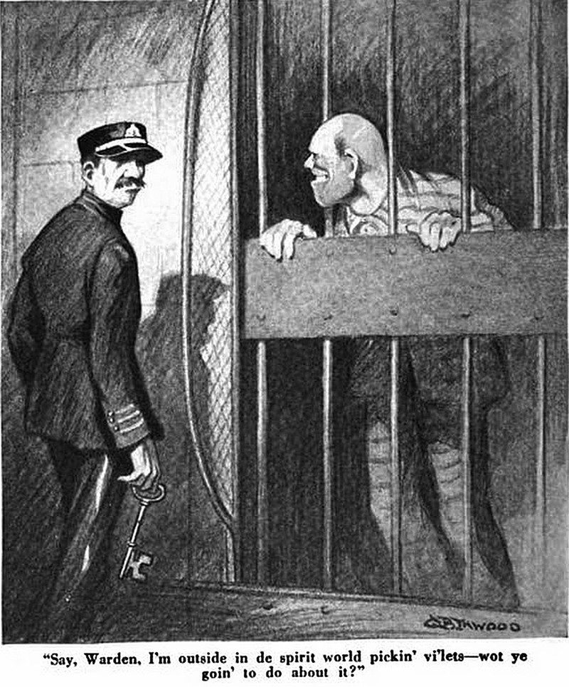 "Say, Warden, I'm outside in de spirit world pickin' vi'lets--wot ye goin' to do about it?" From Life, 1923.
