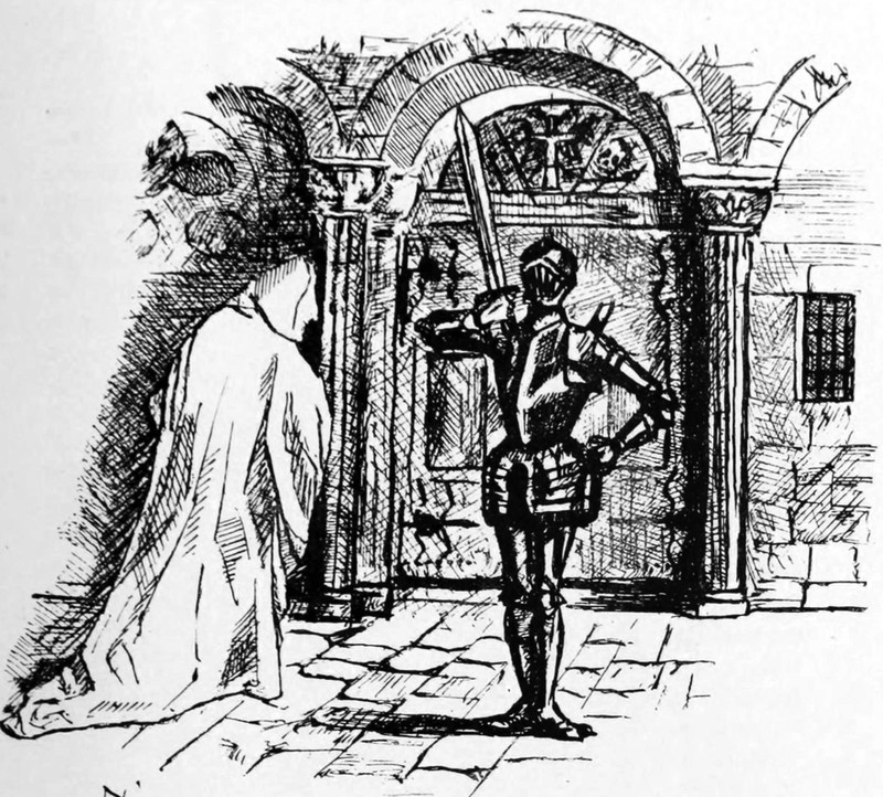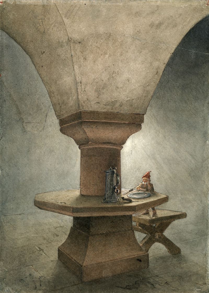 The "tomte" in Glimmingehus medieval castle in south-eastern Scania. The tomte is waiting for his meal at the stone table in the castle hall. Watercolour by unknown artist, possibly by A.T. Gellerstedt, from the later part of the 19th century. Courtesy of Swedish National Heritage.