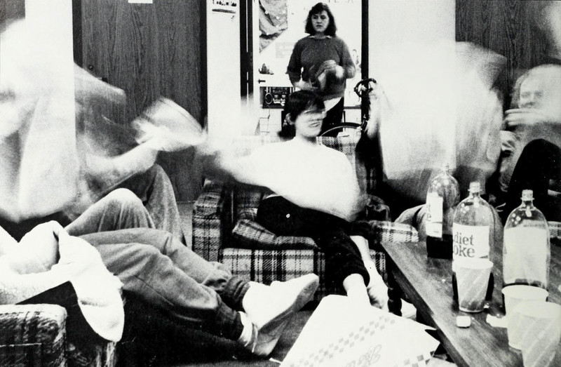 At first glance, we thought this was a pillow fight in progress, but our custom Uncanny Detector app revealed that they are in fact reading newspapers possessed by spook journalists. From Santa Clara's 1987 yearbook.