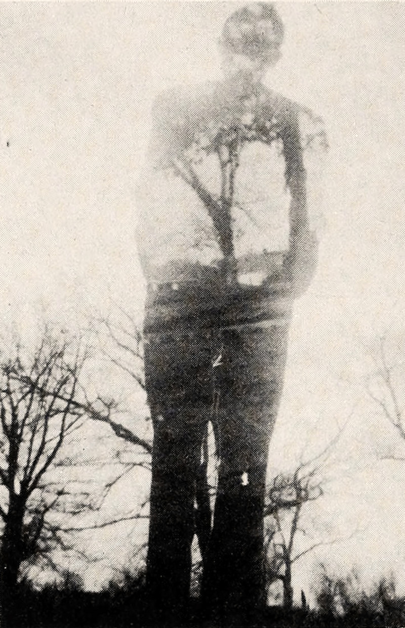 "Spacemen inhabiting human bodies are apparently able to distort photographic film and to make normally invisible forces appear seemingly out of nowhere." From UFO Review, 1980.