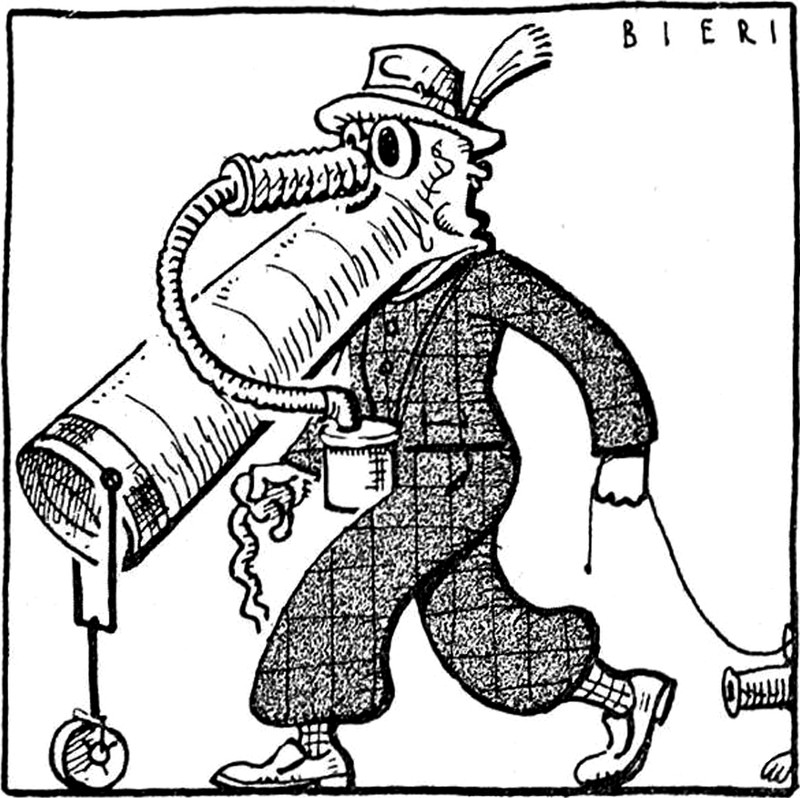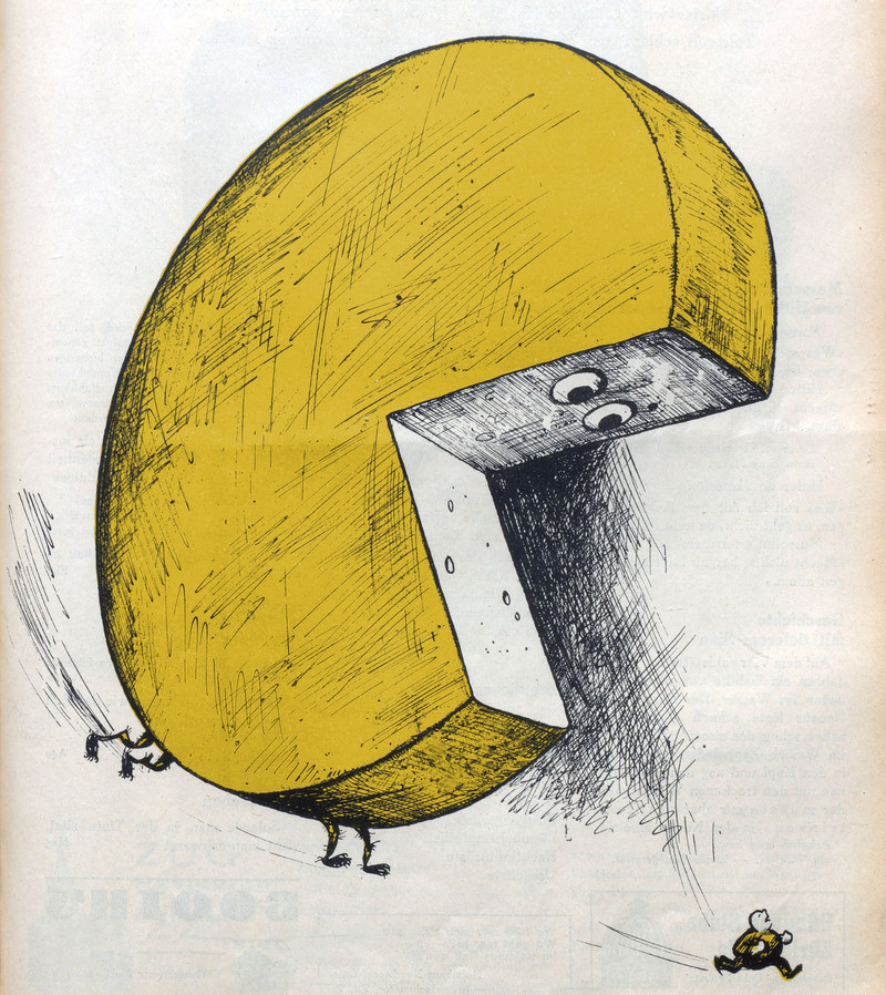 This hungry cheese is a precursor to Pacman. From Nebelspalter, 1935.