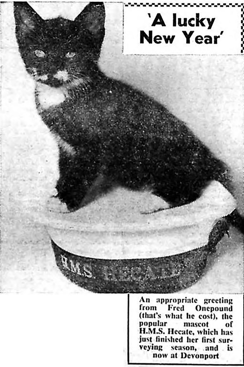 This cat's name, "Fred Onepound," sounds like one of the cat names coined by comedian Bob Mortimer. (Such as Papa Handwash, Bobby Resistance, Softy Pinkpowders, and Sargeant Walnuts). Plus, this cat's the mascot of a ship named after the goddess of sorcery. From Navy News, 1967.