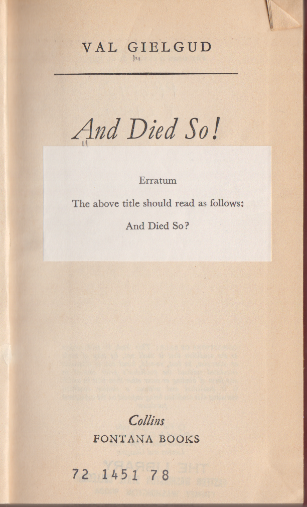 Jonathan shares: This is one of the best errata I've ever encountered. I mean, how often does one see a punctuation erratum? And just imagine the overexcited typesetter reaching automatically for the exclamation point, instead of the question mark! If it's any consolation, it's correctly punctuated with the question mark on the half-title, on the front cover, and of course in the Shakespearean epigraph whence the phrase is sourced.