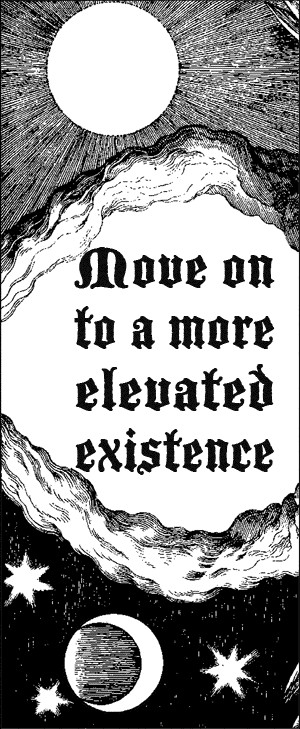Answer: Diabolical. "'Move on to a more elevated existence,' the demon whispered." —Bob Blackman, The Commission, 2004, p. 130. (The answer is in black text on the black background. Highlight it to view.)