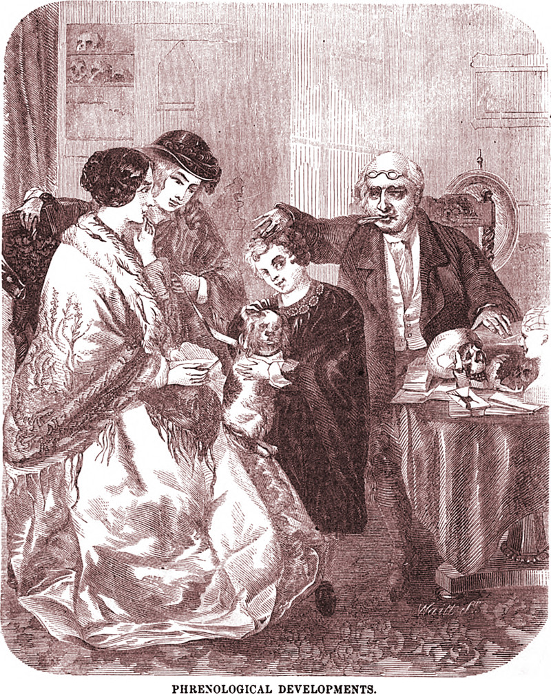 A phrenology patient is inspired to check for bumps on his dog's head in this illustration from Arthur's Home Magazine, 1861. The subspecialty of veterinary phrenology was rare but not unknown. The strange history of an elephant phrenology is told in Jan Bondeson's The Feejee Mermaid and Other Essays in Natural and Unnatural History.