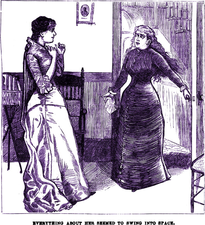 An illustration from an 1885 issue of Frank Leslie's Pleasant Hours magazine. The caption reads: "Everything about her seemed to swing into space."