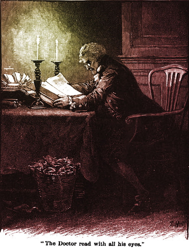 An illustration from an 1889 issue of The Quiver magazine. The caption reads: "The Doctor read with all his eyes."