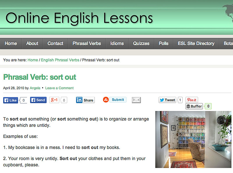 We're tickled that a photo of our rainbow bookshelves illustrates these sentences in an English lesson: "My bookcase is a mess. I need to sort out my books."