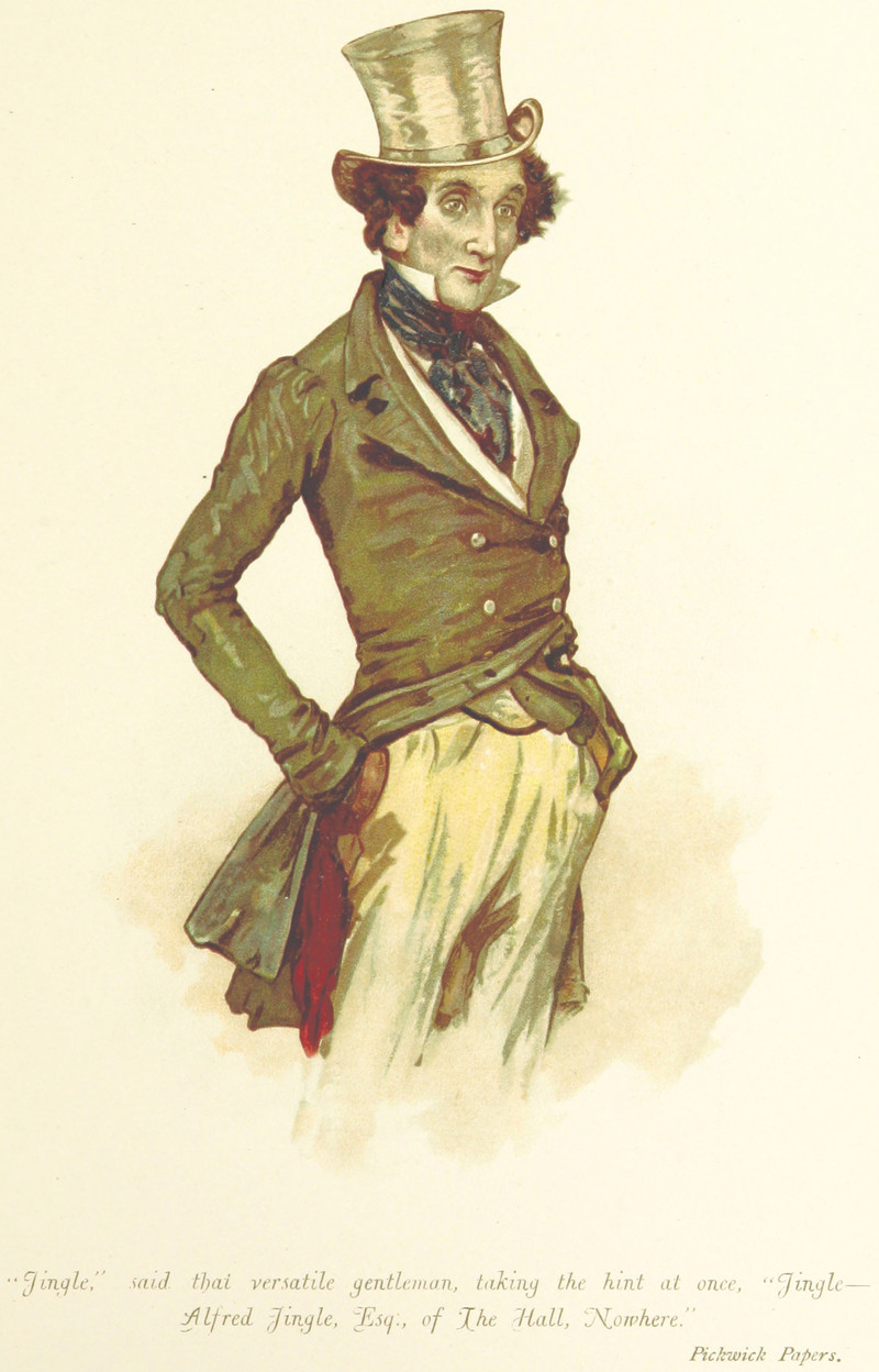 "'Jingle,' said that versatile gentleman, taking the hint at once, 'Jingle—Alfred Jingle, Esq., of The Hall, Nowhere." From Pictures from Dickens with Readings, 1895.