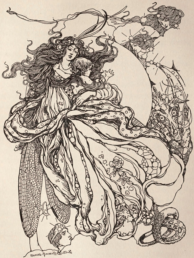 "High overhead, above the sky, their plans are drawn and laid." From The Wonderful Fairies of the Sun by Ernest Vincent Wright and illustrated by Cora M. Norman, 1896.