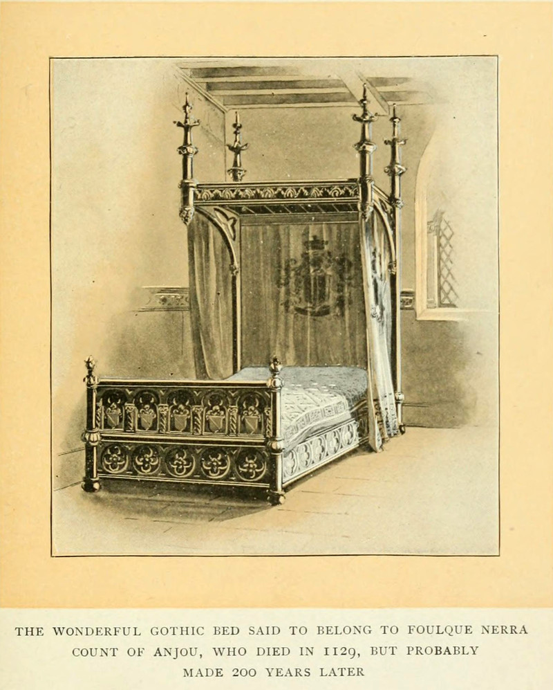 "The wonderful gothic bed said to belong to Foulque Nerra, Count of Anjou, who died in 1129, but probably made 200 years later." From The Witchery of Sleep by Willard Moyer, 1903.