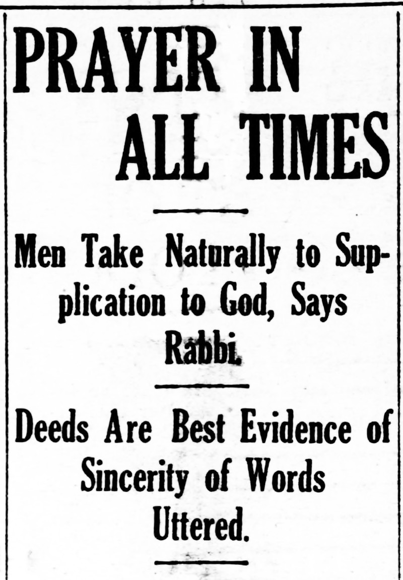 "Prayer in all times. Men take naturally to supplication to God, says rabbi. Deeds are best evidence of sincerity of words uttered." From the Duluth Herald, 1912. See Strange Prayers for Strange Times.