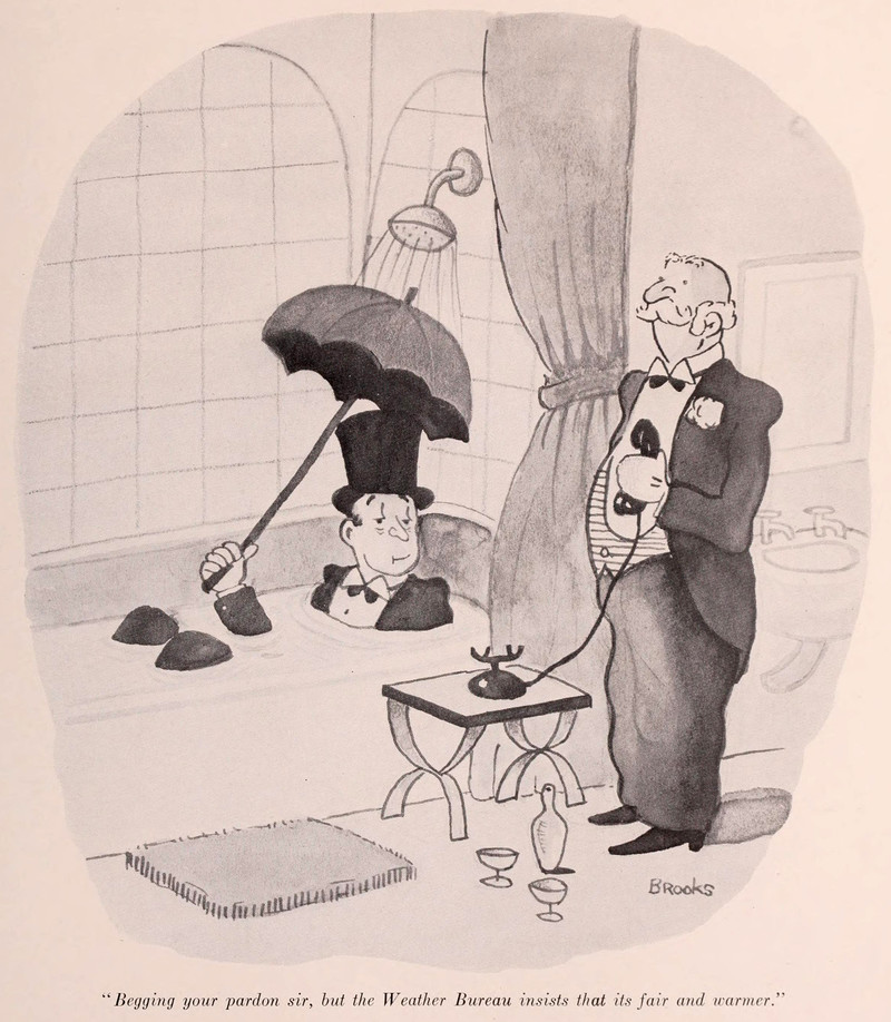 "Begging your pardon, sir, but the Weather Bureau insists that it's fair and warmer." From The Old Line, 1934.