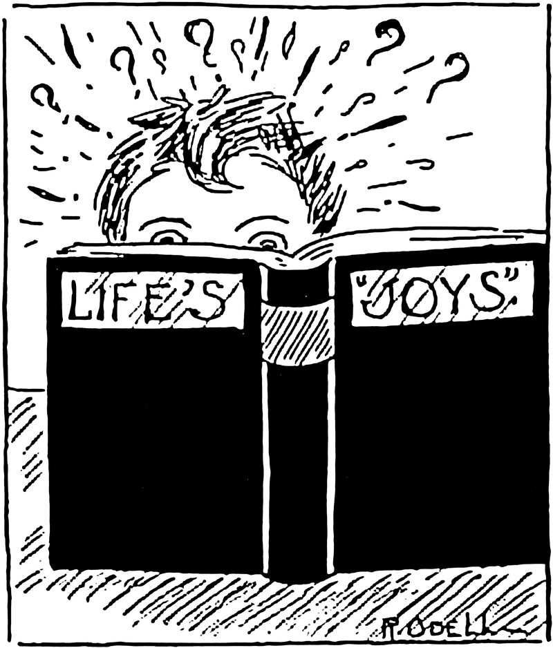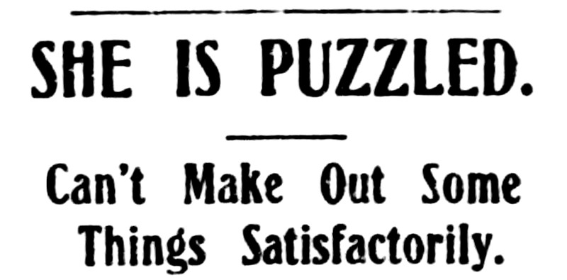 "She is puzzled. Can't make uot some things satisfactorily." From the Duluth Herald, 1906.