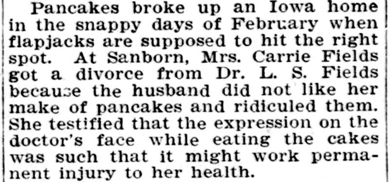 "One Iowa home broken up by the pancake question." Her husband's facial expression while eating her pancakes "was such that it might work permanent injury to her health." From the Duluth Evening Herald, 1906.