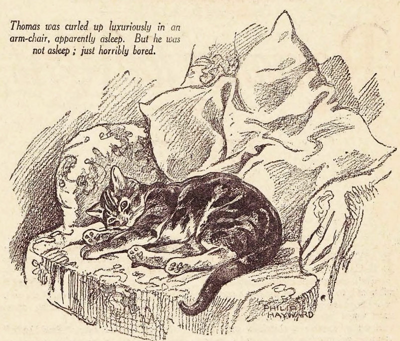 "Thomas was curled up luxuriously in an arm-chair, apparently asleep. But he was not asleep; just horribly bored." From The Merry Magazine, 1929.