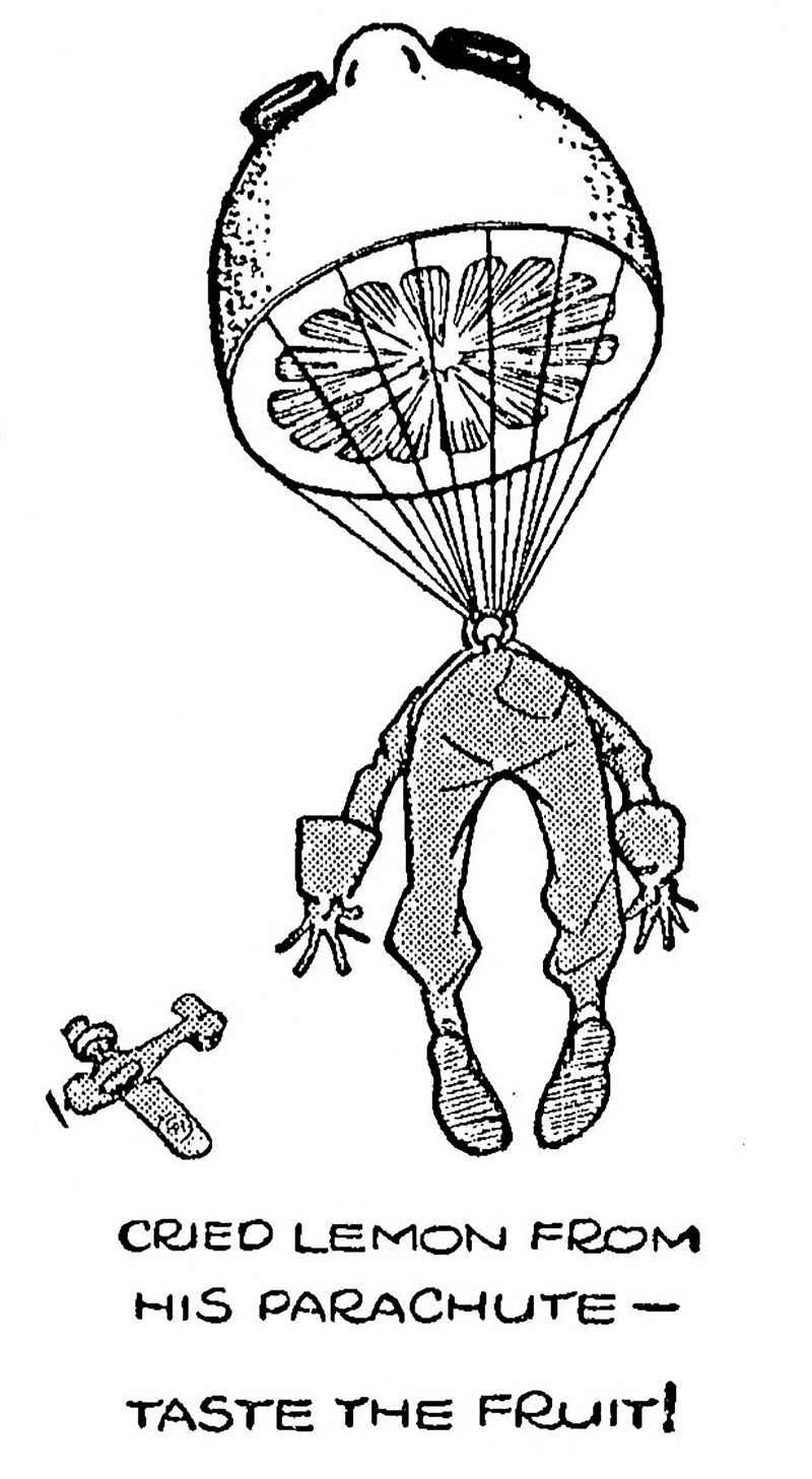 Today's parachuting lemon crying "Taste the fruit!" is from The Children's Newspaper, 1938.