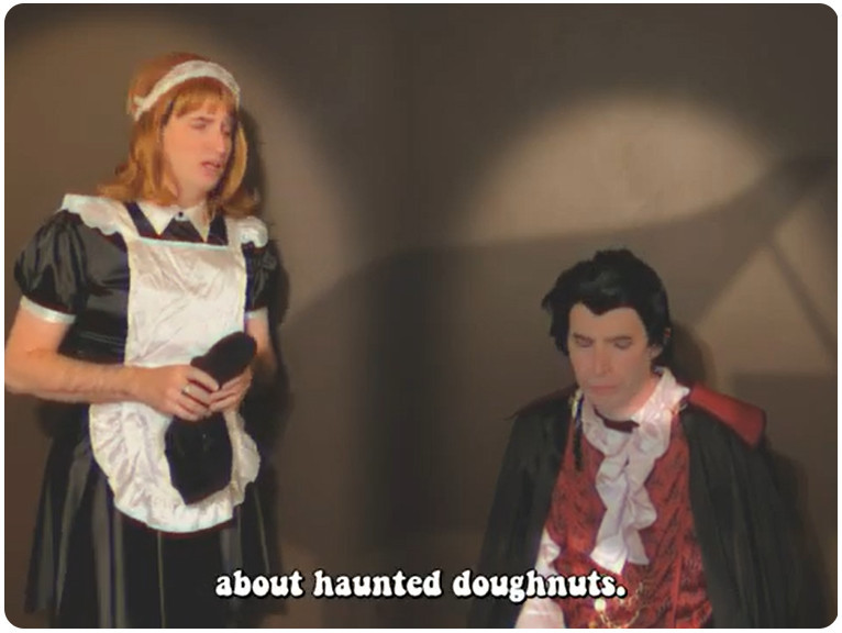 Mixing vampire humor and 1970s tropes (like pet rocks, lava lamps, disco music, bell-bottom pants, mirror balls, and of course mood rings), the web series Grave Mood Rings pokes fast fun at classic slow-moving Gothic soap operas like Dark Shadows and the Canadian series Strange Paradise. In addition to a vampiric Viscount, a castle is home to a groovy Doctor (a phlebotomist, naturally), a jolly housekeeper with her own laugh track, a werewolf Vicar, and an arch-nemesis riddler wearing a Sphinx mask. Corny wordplay, the occasional bizarre sing-a-long, and haunted doughnuts punctuate the proceedings, in the tradition of the sketch comedy of MadTV, Kids in the Hall, and SCTV.