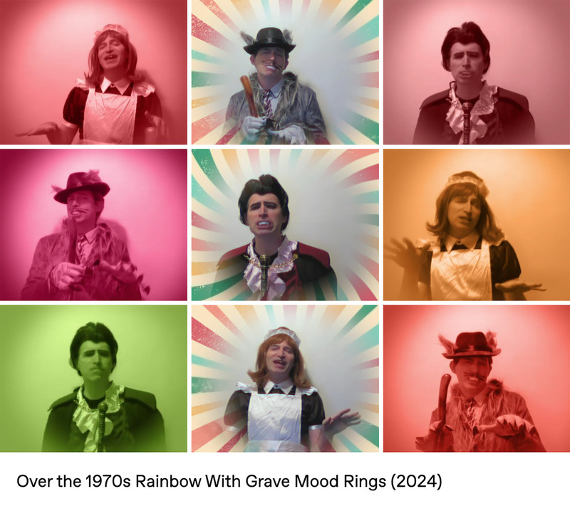 Parody analog horror meets 1970s tropes (like pet rocks, lava lamps, disco music, bell-bottom pants, mirror balls, and of course mood rings) in the web series Grave Mood Rings. It pokes fast fun at classic slow-moving Gothic soap operas like Dark Shadows and the Canadian series Strange Paradise. In addition to a vampiric Viscount, a castle is home to a groovy Doctor (a phlebotomist, naturally), a jolly housekeeper with her own laugh track, a werewolf Vicar, and an arch-nemesis riddler wearing a Sphinx mask. Corny wordplay, the occasional bizarre sing-a-long, and haunted doughnuts punctuate the proceedings, in the tradition of the sketch comedy of MadTV, Kids in the Hall, and SCTV.