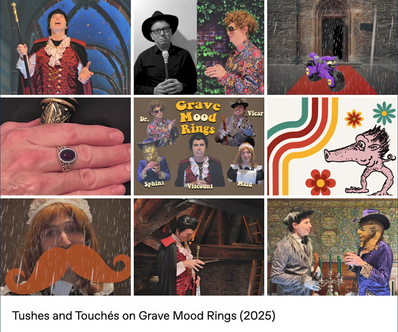 A demonic clown puppet invades Vitchmik Hall. Parody analog horror meets 1970s tropes (like pet rocks, lava lamps, disco music, bell-bottom pants, mirror balls, and of course mood rings) in the web series Grave Mood Rings. It pokes fast fun at classic slow-moving Gothic soap operas like Dark Shadows and the Canadian series Strange Paradise. In addition to a vampiric Viscount, a castle is home to a groovy Doctor (a phlebotomist, naturally), a jolly housekeeper with her own laugh track, a werewolf Vicar, and an arch-nemesis riddler wearing a Sphinx mask. Corny wordplay, the occasional bizarre sing-a-long, and haunted doughnuts punctuate the proceedings, in the tradition of the sketch comedy of MadTV, Kids in the Hall, and SCTV.