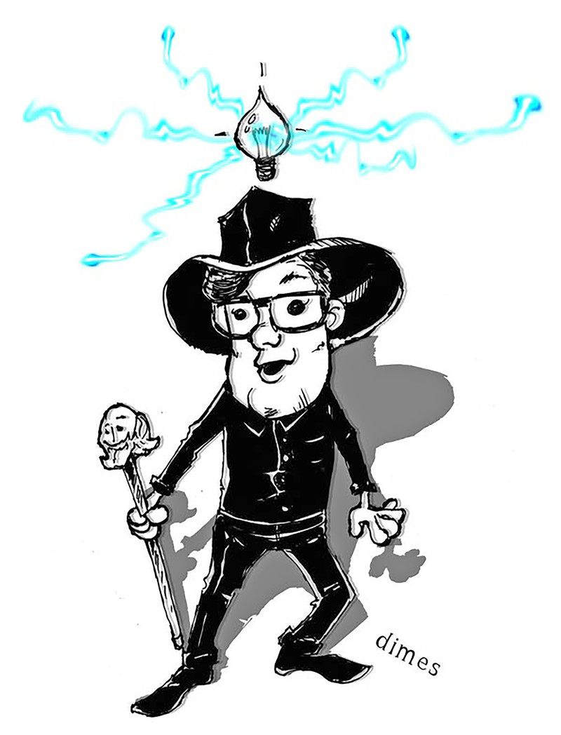 "Here we have the charming Professor Oddfellow. He always appears to be in some sort of purgatorial void. Clearly it must be a beneficent plane, and he its sole black clad mark, where he becomes the emissary vessel of such brilliant and astounding obscurities." —John Dimes