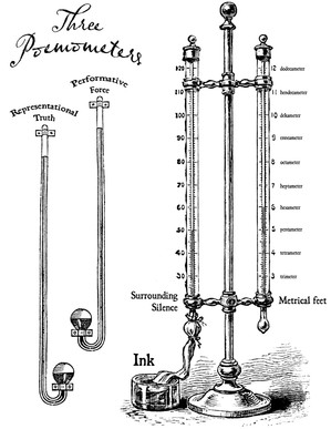 This piece is in honor of Geof Huth, who measures the value of a poem with a poemometer. Geof blogged his response: How Craig Conley (the author of One-Letter Words: A Dictionary) does this, I do not know, but here, after less than a day’s work, are diagrams of three poemometers (based on my reference to same last night). Note that the largest measures the metrical feet (the sounds) against the surrounding silence the poem always fights against. (This one device is not calibrated finely enough to allow for dimeter, but we will do without that as necessary). The other two poemometers measure performative force and representational truth. Even though being the more sophisticated devices, they are simpler in structure. I am not sure when Craig will have these ready for sale, but I expect it will be soon.