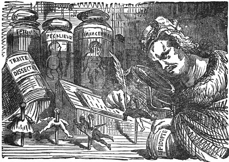 "The above Illustration exemplifies the various Natural Transitions from the Original Rib to a Young Lady of the 1875 Period. —N.B. If all the Ribs turned out as satisfactorily, no one would be disposed to make any Bones about them." From Judy, Or The London Serio-Comic Journal, 1875.