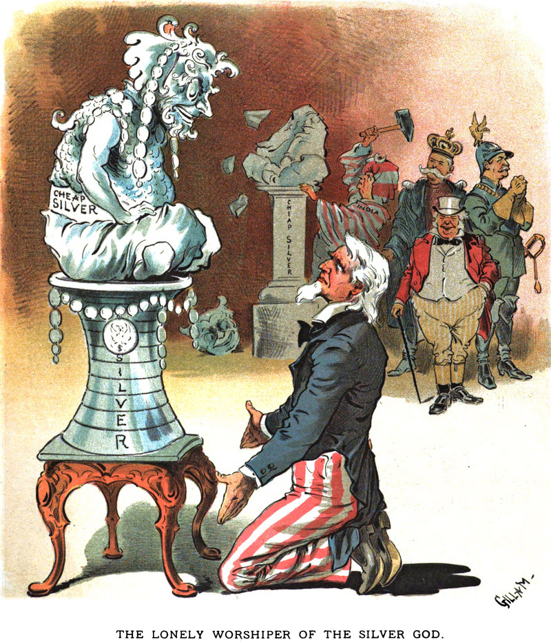 Worshipping the god of cheap silver. From The Judge, 1893.