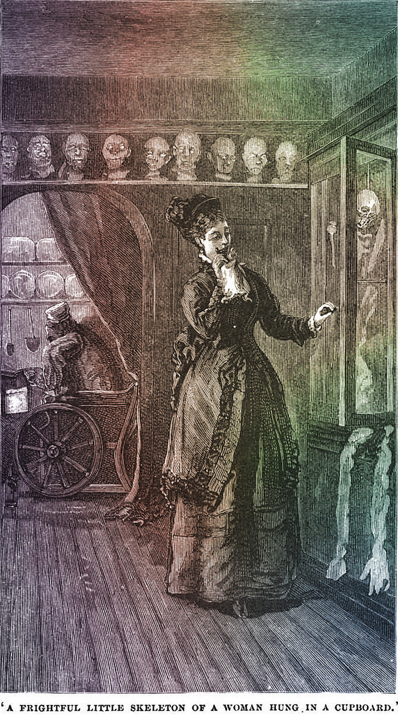 "A frightful little skeleton of a woman hung in the cupboard." From The Law and the Lady by Wilkie Collins, 1875.