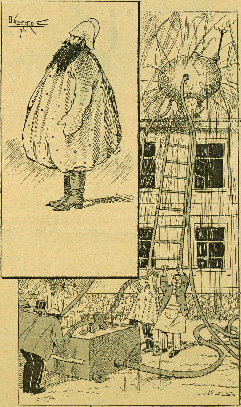 Reblog if you would wear a sprinkler suit and climb to a rooftop to be used in this way. From Le Pêle-Mêle, 1896.