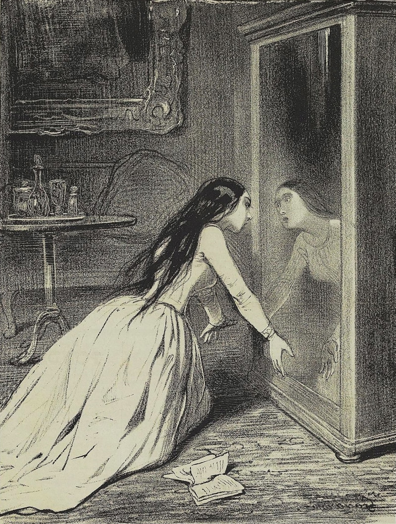 The devil, from inside a mirror, watches a man escape from the rheumatism spirit. From The Devil's Bride by Milton H. Stine, 1910.