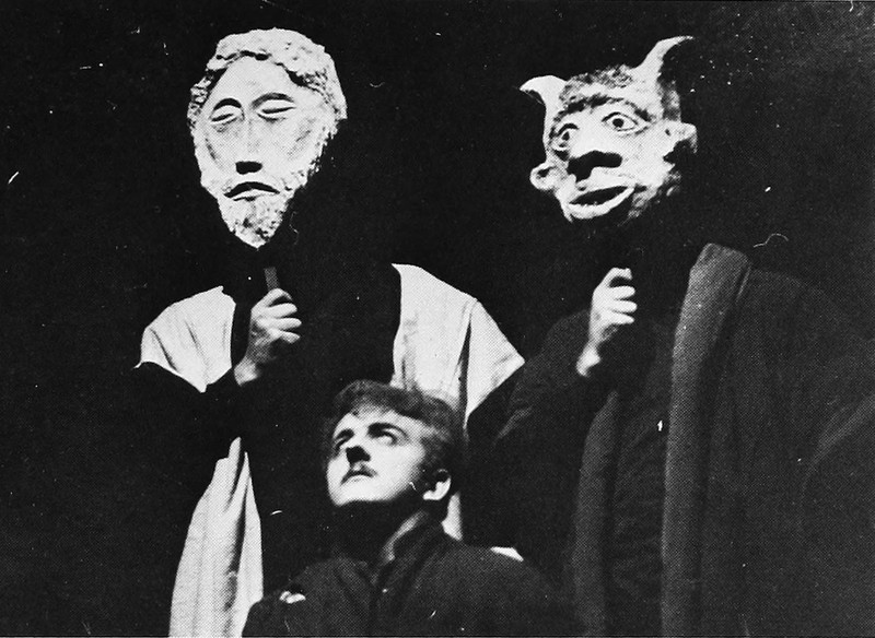 We've never heard a good explanation, but it's true that if comedy and tragedy masks are after you, a ukulele is the best defense. From Kansas State's 1928 yearbook.