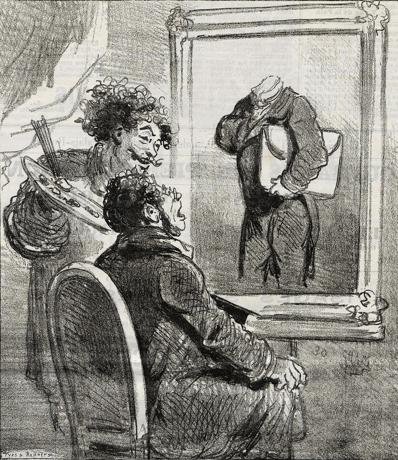 Paintings interact with your shadow, but that tends to happen behind your back. From Le Charivari, 1879.