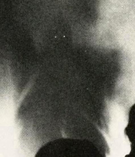 Our custom Uncanny Detector app caught a detail we would have missed: a dark, cloaked entity rising from the flames. (See enlargement.) From Wake Forest's 1952 yearbook. See How to Hoodoo Hack a Yearbook.