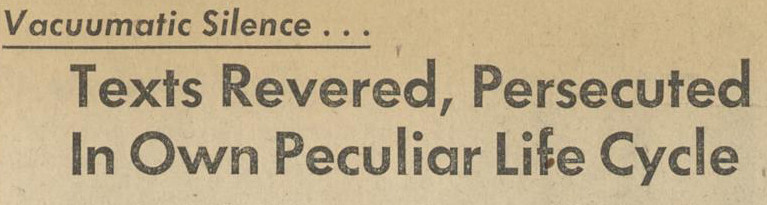 "Texts revered, persecuted in own peculiar life cycle" marked by "vacuumatic silence." From the Brigham Young Universe newspaper, 1953.