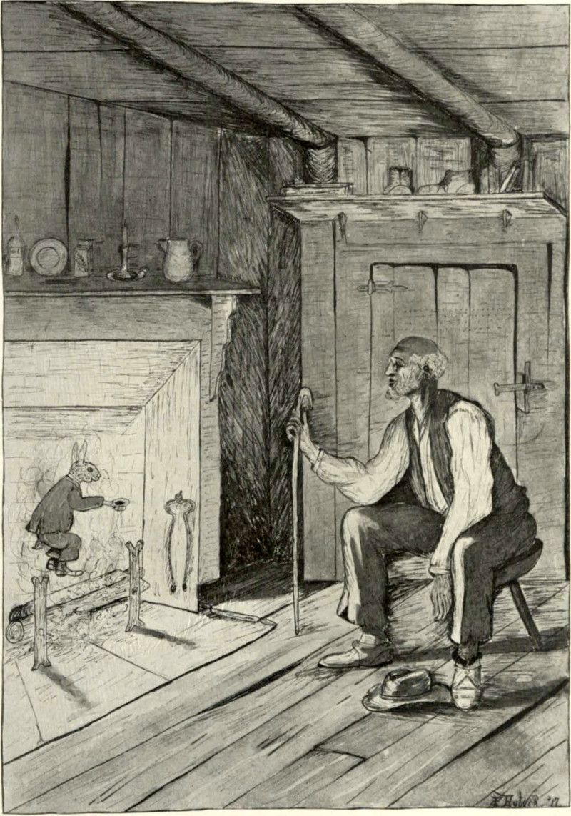 The bear gnaws the old woman's shoe. From A Book of Fairy-Tale Bears by Clifton Johnson and illustrated by Frank A. Nankivell, 1913.