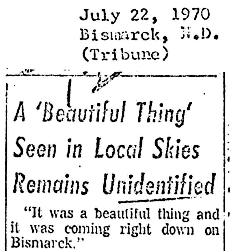 "It was a beautiful thing and it was coming right down on Bismarck." From UFO Newsclipping Service, 1970.