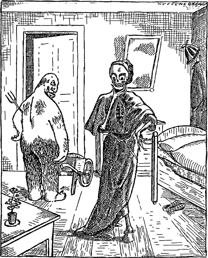 It's not always properly depicted, but the Grim Reaper's cloak really is see-thru. From Nebelspalter, 1919.